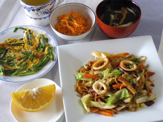 焼きそば(タマネギ、ニンジン、キャベツ、ちくわ、イカ)、吸い物(ワカメ、シメジ、人参)、ニラの卵焼き、人参サラダ、甘夏