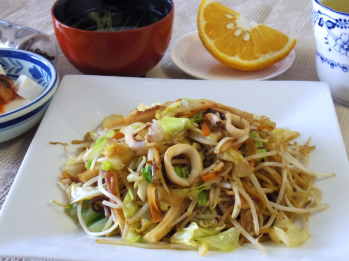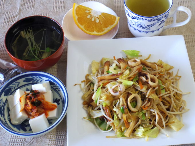 焼きそば(タマネギ、ニンジン、キャベツ、モヤシ、チクワ、イカ)、吸い物(ワカメ、エノキダケ、カイワレ大根)、冷や奴(キムチ)、甘夏