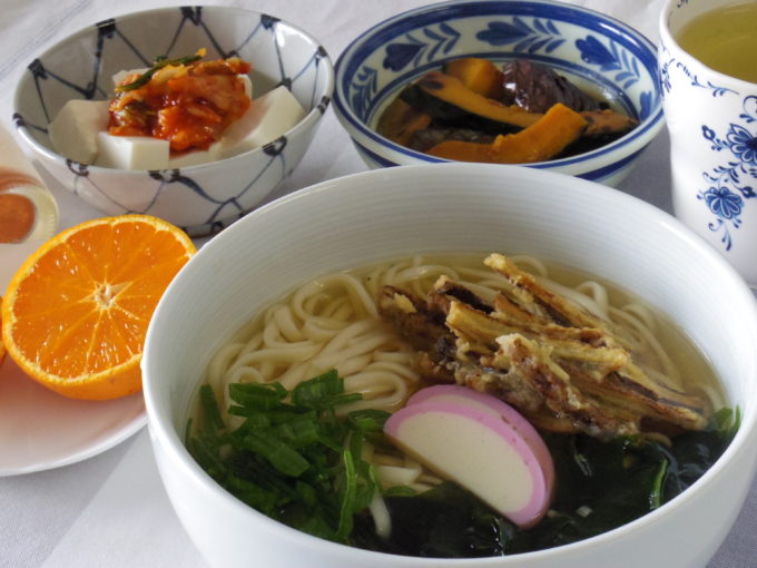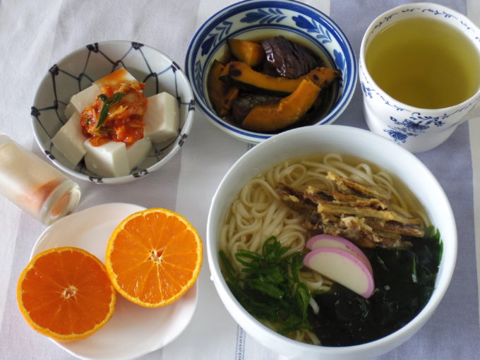 天ぷらうどん(細うどん乾麺90グラム、ワカメ、ネギ、カマボコ、ゴボウのかき揚げ)、冷や奴(キムチ)、ナスとカボチャの焼き浸し、なつみ