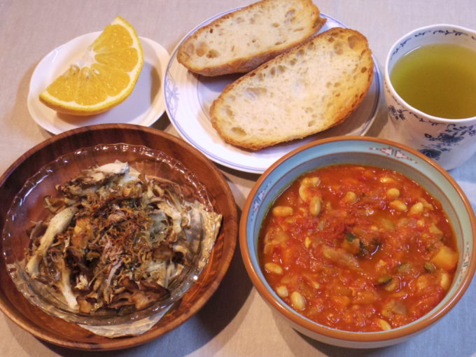 カンパーニュトースト、ミネストローネ、マイタケとちりめんのアヒージョ(ニンニクオイル)、甘夏