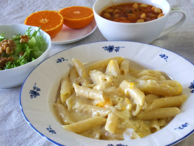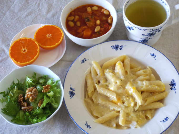 ペンネ・カルボナーラ(乾麺90グラム。ニンニクオイル、卵)、ミネストローネ、サラダ(フリルレタス、クルミ。岩塩、黒胡椒、オリーブオイル)、なつみ