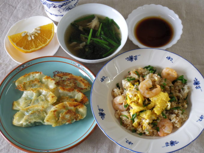 炒飯(ご飯150グラム。エビ、ネギ、卵)、スープ(ワカメ、マイタケ、ニラ)、海鮮餃子(エビ、イカ、ニラ、キャベツ)、甘夏