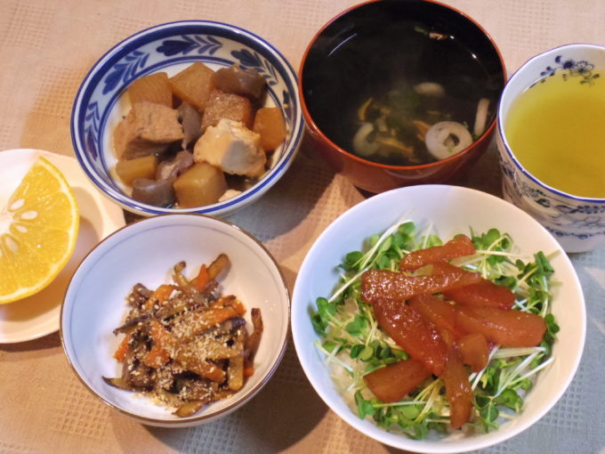 マグロの漬け丼(酢飯。カイワレ大根、マグロ)、吸い物(インスタント)、ゴボウと人参のきんぴら(ごま)、大根の煮物(コンニャク、厚揚げ)、甘夏
