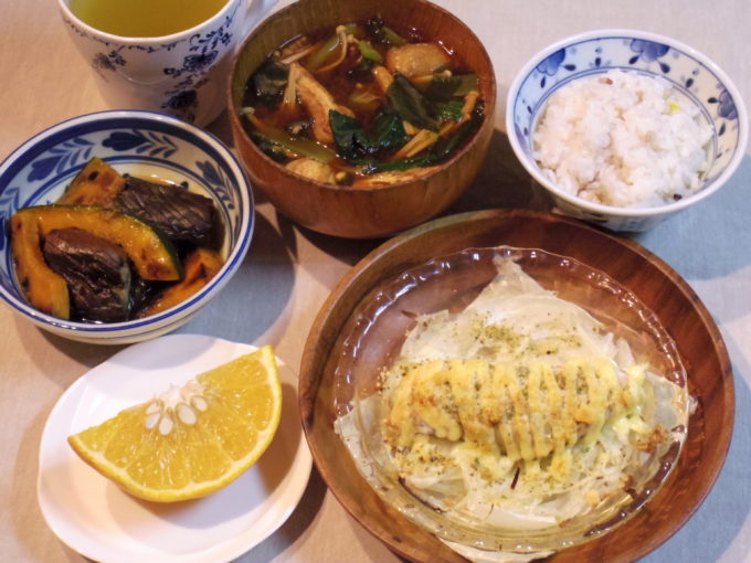 雑穀入りご飯120グラム、味噌汁(ワカメ、エノキダケ、小松菜、油揚げ)、サケのマヨネーズ焼き(タマネギ)、ナスとカボチャの焼き浸し、甘夏
