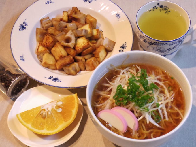 ラーメン(生麺110グラム。モヤシ、ネギ、カマボコ)、レンコンと厚揚げのオイスターソース炒め、甘夏
