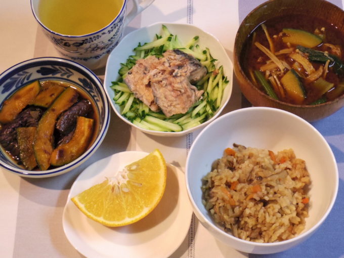 炊き込みご飯(ゴボウ、人参、シメジ、油揚げ)、味噌汁(切り干し大根、エノキダケ、カボチャ、小松菜)、ナスとカボチャの焼き浸し、サバの水煮(キュウリ)、甘夏