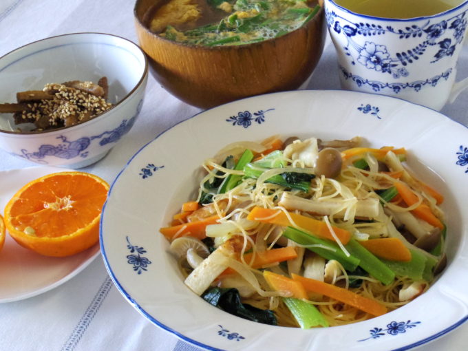焼きビーフン(タマネギ、ニンジン、シメジ、小松菜、チクワ)、ニラと卵の吸い物、ゴボウの甘酢炒め(ごま)、なつみ