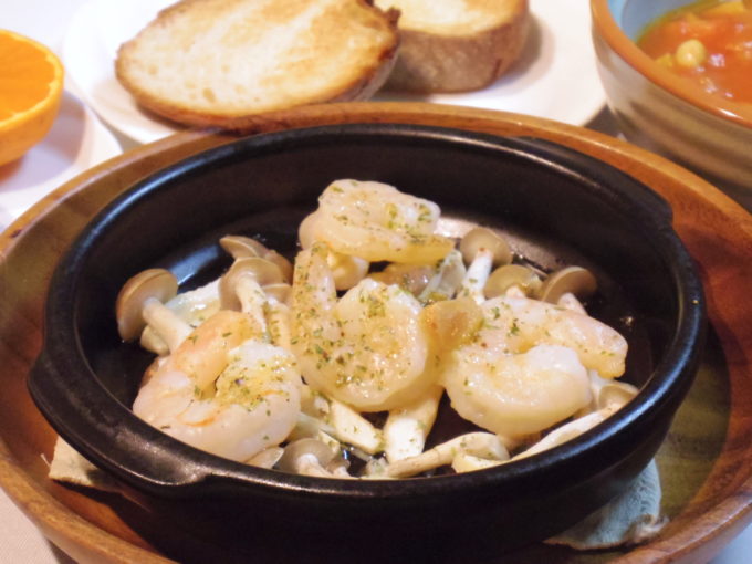 バタール、ミネストローネ、エビとシメジのアヒージョ(マジックソルト、ガーリックオイル)、なつみ