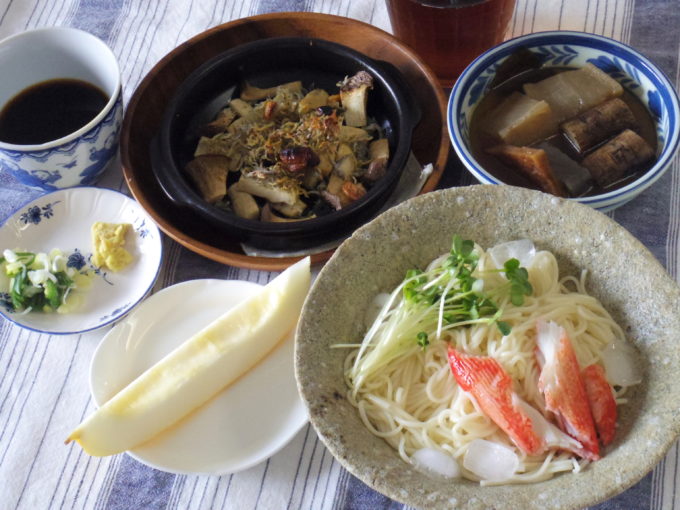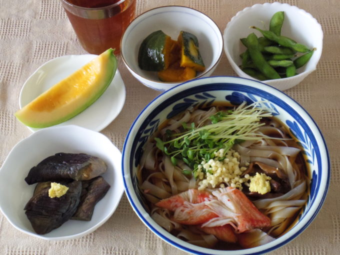 冷やしきしめん(乾麺90グラム。干しシイタケ、カイワレ大根、カニかまぼこ、ショウガ、天かす)、ナスの焼き浸し、カボチャの含め煮、枝豆、プリンスメロン