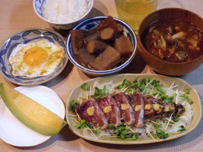 ご飯120グラム、味噌汁(シメジ、ナス、キャベツ)、カツオのたたき(タマネギ、カイワレ大根)、煮物、目玉焼き、プリンスメロン