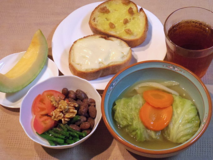 チーズトースト、ガーリックトースト、ロールキャベツ、サラダ(うずら豆、ササゲ、トマト、クルミ)、プリンスメロン