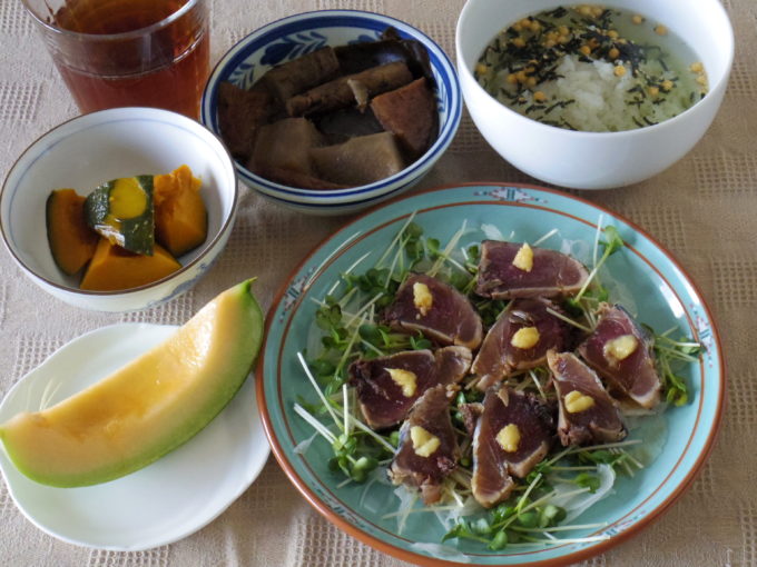 お茶漬け、カツオのたたき、煮物、カボチャの含め煮、プリンスメロン