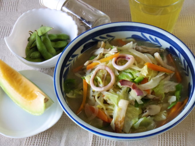 ちゃんぽん(タマネギ、ニンジン、キャベツ、ピーマン、マイタケ、チクワ、イカ)、枝豆、プリンスメロン