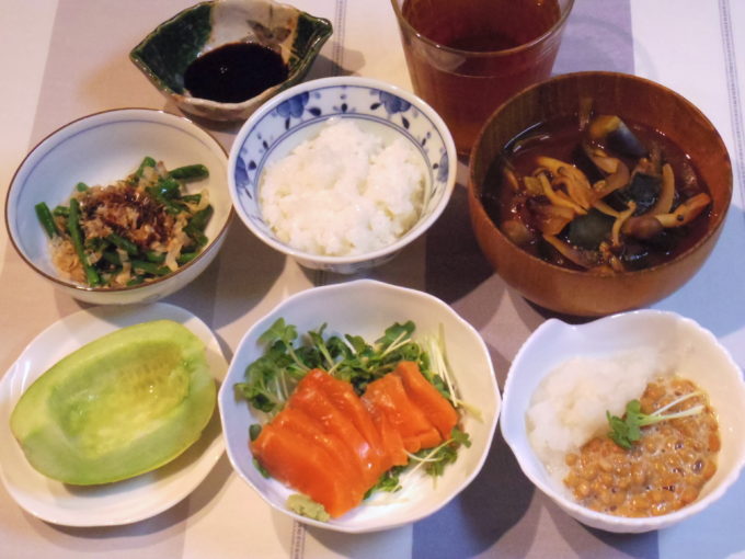 ご飯、味噌汁(ワカメ、タマネギ、シメジ、ナス)、サーモンの刺身(カイワレ大根)、おろし納豆、ササゲのおひたし、タイガーメロン