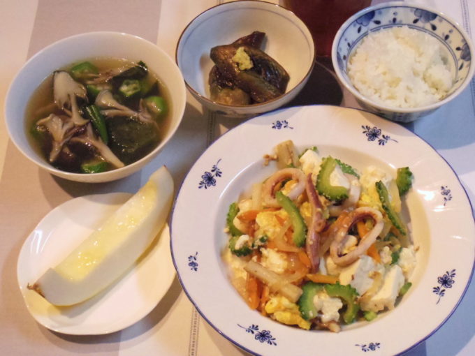 ご飯、スープ(ワカメ、オクラ、マイタケ)、ゴーヤーチャンプルー(タマネギ、ニンジン、ニガウリ、豆腐、ちくわ、イカ、卵)、ナスの焼き浸し、キナウリ