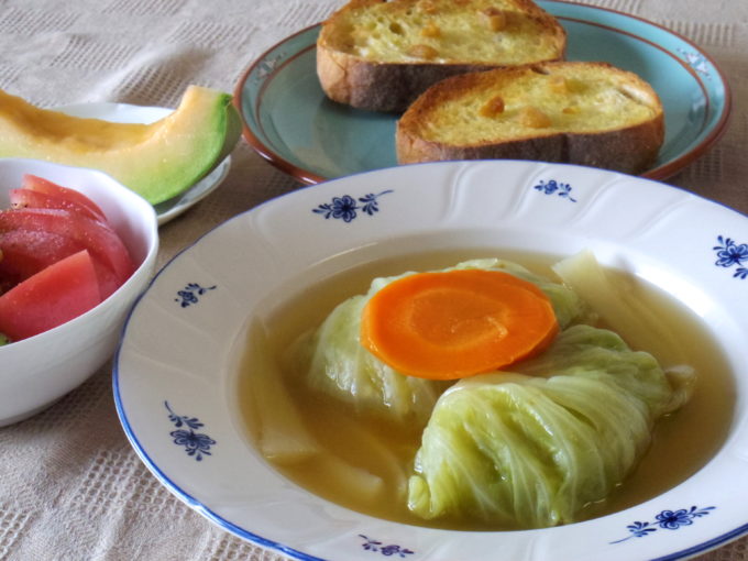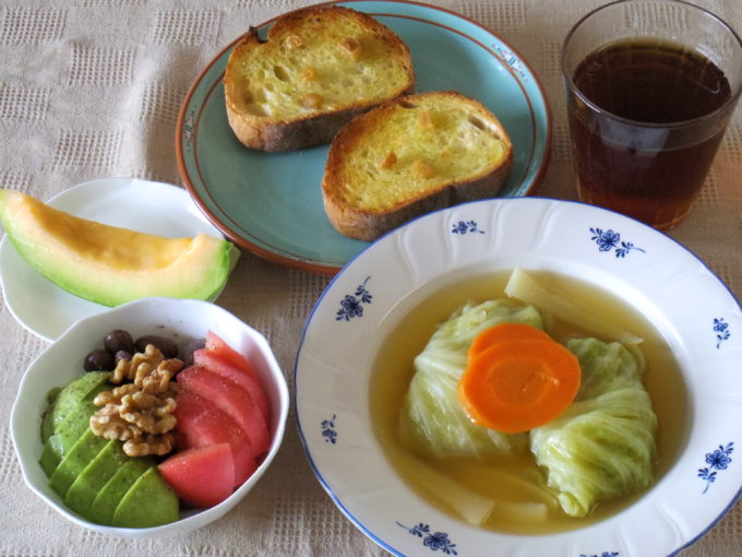 ガーリックトースト、ロールキャベツ(キャベツ、シーフードミックス、タマネギ。コンソメ)、サラダ(ウズラ豆、アボカド、トマト、クルミ。岩塩、黒胡椒、オリーブオイル)、プリンスメロン