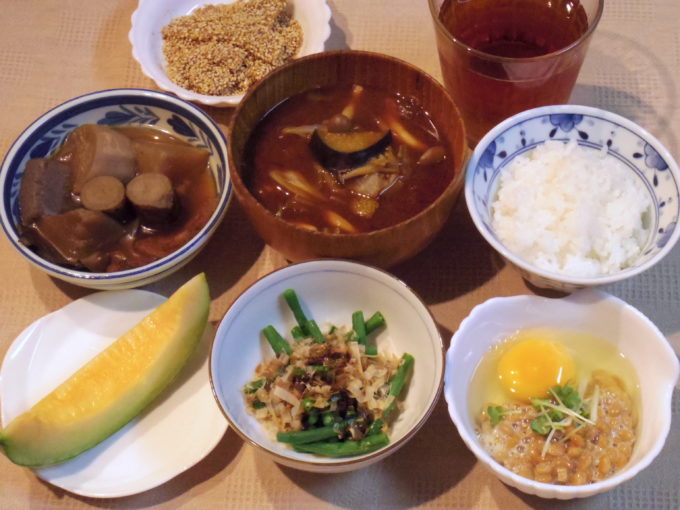 ご飯、味噌汁(ナス、キャベツ、シメジ)、煮物、ササゲのおひたし、納豆(卵、貝割れ菜)、メンマ、プリンスメロン