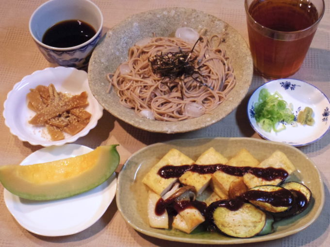 ざるそば(乾麺90グラム。海苔)、焼き物(厚揚げ、ナス、エリンギ。甘味噌)、メンマ(ごま)、プリンスメロン