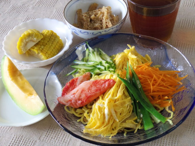 冷やし中華(生麺110グラム。キュウリ、オクラ、人参、カニかまぼこ、錦糸卵)、レンコンの甘酢炒め、トウモロコシ、プリンスメロン