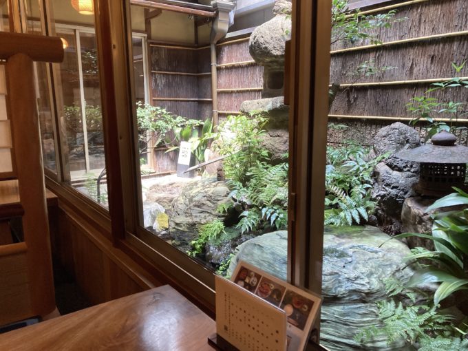 一人でしたが、坪庭に面した4人がけのテーブル席に案内されました。歓楽街にあるとは思えないほど静謐な空間です。