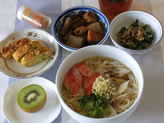 にゅうめん(乾麺90グラム。ネギ、マイタケ、カニカマ、天かす)、根菜の煮物(ゴボウ、人参、大根、コンニャク、ゴボウ天、昆布)、ツルムラサキのおひたし、ネギとチリメンの卵焼き、キウイ