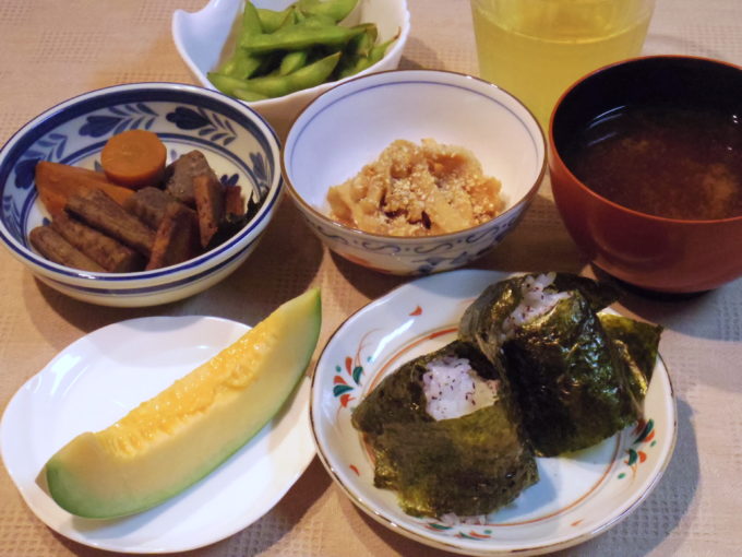 おにぎり(ゆかり、海苔)、味噌汁(インスタント)、煮物、レンコンの甘酢炒め、枝豆、プリンスメロン