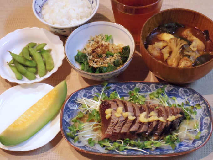 ご飯、味噌汁(ワカメ、マイタケ、キャベツ、油揚げ)、カツオのたたき(タマネギ、カイワレ大根)、ツルムラサキのおひたし、枝豆、プリンスメロン