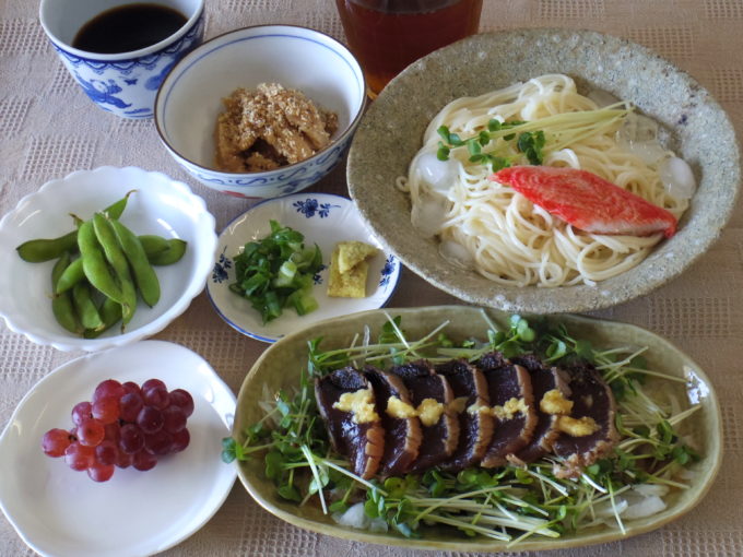 冷や麦(乾麺100グラム)、カツオのたたき、レンコンの甘酢炒め、枝豆、ブドウ