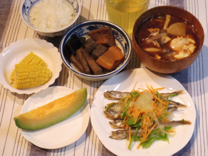 ご飯120グラム、味噌汁(大根、タマネギ、シメジ、卵)、シシャモの南蛮漬け(タマネギ、ニンジン、ピーマン)、煮物(ゴボウ、人参、コンニャク、丸天、昆布)、トウモロコシ、プリンスメロン
