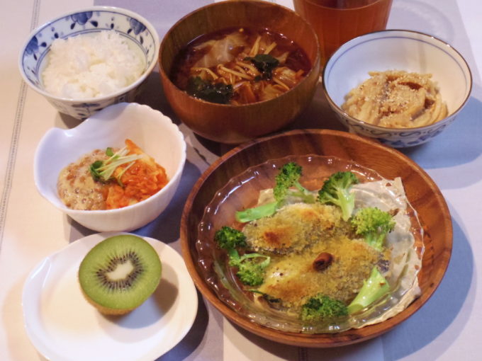 ご飯、味噌汁(ワカメ、キャベツ、エノキダケ)、アジのパン粉焼き(ブロッコリー、ガーリックオイル)、レンコンの甘酢炒め、キムチ納豆、キウイ