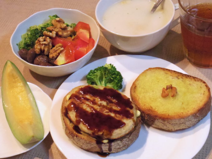 オープンサンド(バタール、白身魚のハンバーグ)、ガーリックトースト、ポタージュ(インスタント)、サラダ(うずら豆、ブロッコリー、トマト、クルミ)、プリンスメロン