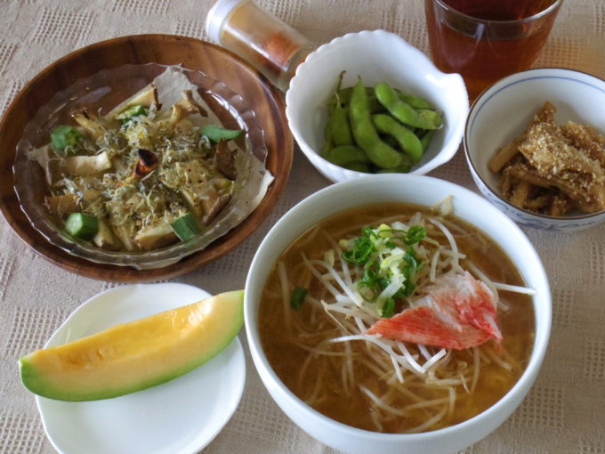 味噌ラーメン(生麺110グラム。モヤシ、ネギ、カニかまぼこ)、アヒージョ(エリンギ、オクラ、チリメン。ガーリックオイル)、レンコンの甘酢炒め、枝豆、プリンスメロン