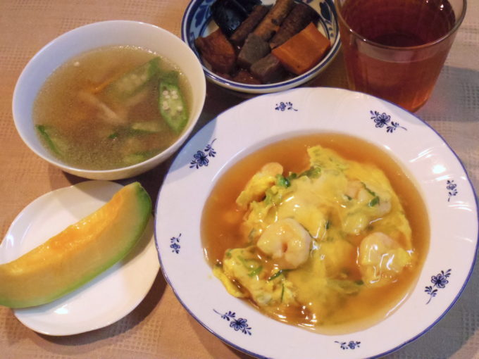 天津飯(ご飯、卵2個、エビ、ネギ)、スープ(人参、マイタケ、オクラ)、煮物、プリンスメロン
