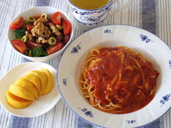 スパゲティ・アラビアータ(乾麺90グラム)、サラダ(ブロッコリー、金時豆、ミニトマト、クルミ、オリーブ)、柿