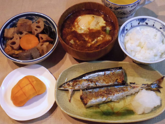 ご飯、味噌汁(サツマイモ、マイタケ、インゲン、卵)、サンマの塩焼き(おろし大根)、レンコンの煮物、柿