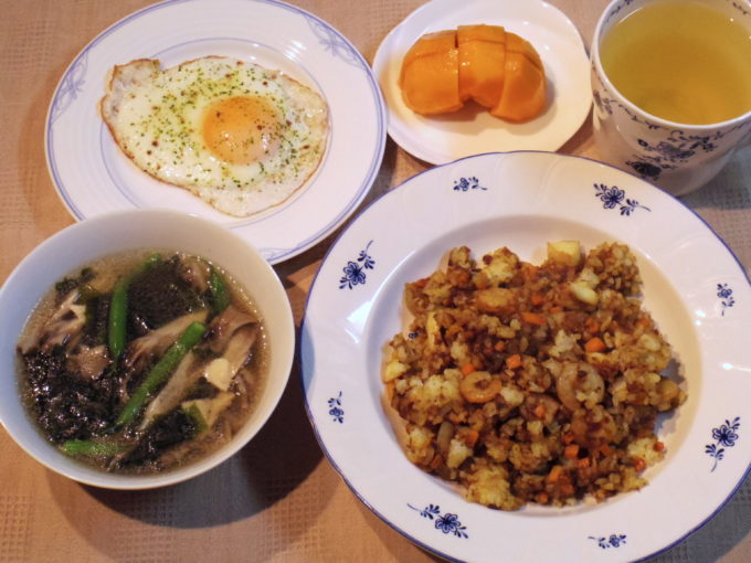 カレー炒飯(ご飯、タマネギ、ニンジン、シーフードミックス)、スープ(ワカメ、マイタケ、インゲン)、目玉焼き、柿