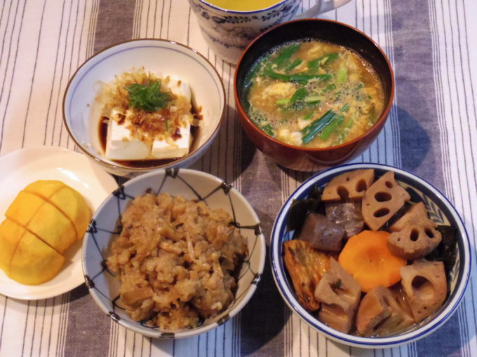 キノコの炊き込みご飯(シメジ、エノキ、マイタケ、エリンギ、油揚げ)、ニラ玉の吸い物、レンコンの煮物(人参、コンニャク、三角揚げ、昆布)、温奴(ネギ)、柿