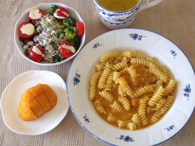 フジッリ・タラコクリーム(乾麺90グラム)。サラダ(ブロッコリー、金時豆、チリメン、ミニトマト。辛子マヨネーズと豆乳のドレッシング)、柿