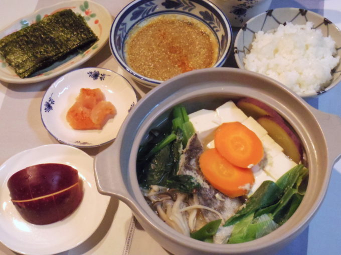 ご飯、水炊き(豆腐、タラ、サツマイモ、人参、小松菜、ネギ、シメジ、エノキダケ)、辛子明太子、海苔、リンゴ