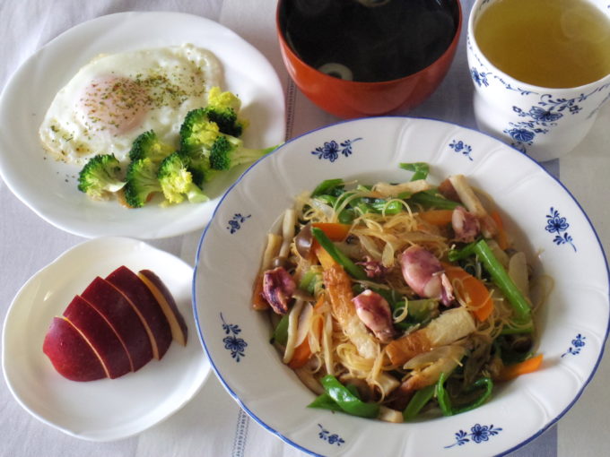 焼きビーフン(タマネギ、ニンジン、シメジ、ピーマン、小松菜、チクワ、コヤリイカ)、吸い物(インスタント)、目玉焼き(ブロッコリー)、リンゴ