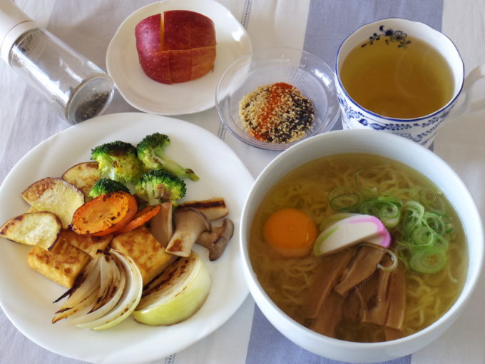ラーメン(生麺110グラム。ネギ、かまぼこ、メンマ、卵)、焼き物(タマネギ、ニンジン、サツマイモ、ブロッコリー、エリンギ、厚揚げ。甘味噌、ごま、一味唐辛子)、リンゴ