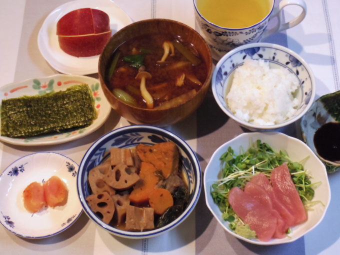 ご飯、味噌汁(シメジ、大根、小松菜)、マグロの刺身(カイワレ大根)、レンコンの煮物、辛子明太子、海苔、リンゴ