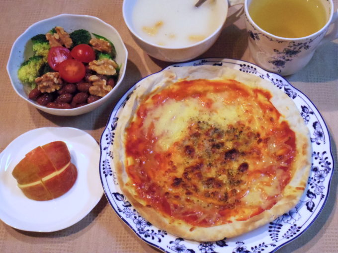 ピザ・マルガリータ、ポタージュ(インスタント)、サラダ(ブロッコリー、金時豆、ミニトマト、クルミ)、リンゴ