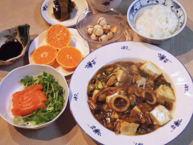 ご飯、麻婆豆腐(豆腐、ナス、シメジ、ネギ、イカ)、サーモンの刺身(カイワレ大根)、昆布巻き、ギンナン、ミカン