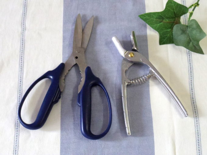 左が万能ハサミ。真ん中くらいのギザギザした所にギンナンをはさんで割っていた。本来はネジ空けに使う部位のようです。