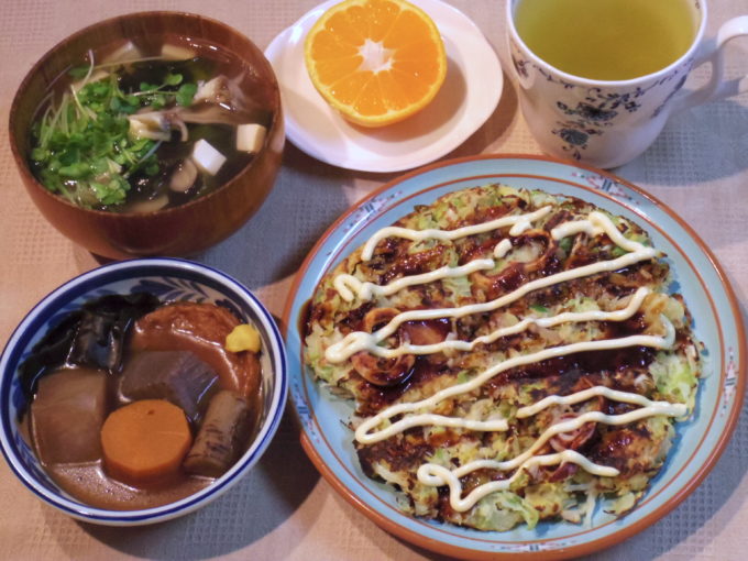 お好み焼き(小麦粉、卵、かつお節削り、キャベツ、エノキダケ、イカ、天かす。ソースとマヨネーズ)、吸い物(ワカメ、マイタケ、豆腐、カイワレ大根)、煮物、ミカン