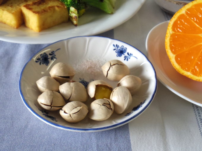 割れ目を入れたギンナンは封筒に入れて口を2度折り、500Wの電子レンジで40秒加熱。ガリガリとひいたピンク岩塩を付けていただきます。