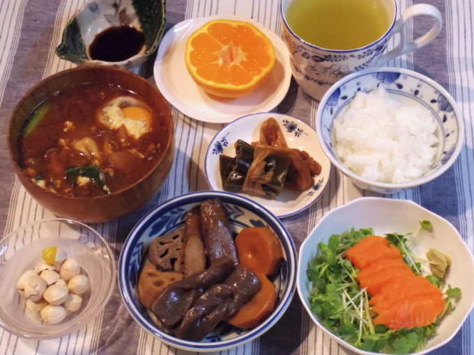 ご飯、味噌汁(サツマイモ、シメジ、小松菜、卵)、サーモンの刺身(カイワレ大根)、煮しめ、昆布巻き、ギンナン、ミカン