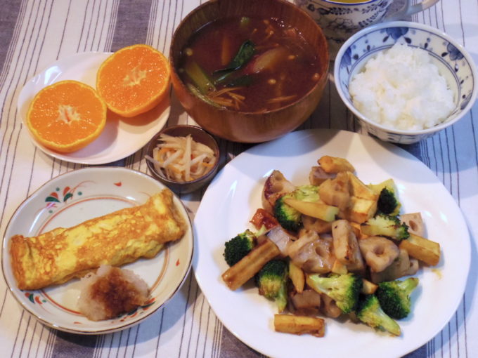 ご飯、味噌汁(サツマイモ、エノキダケ、小松菜)、レンコンと厚揚げのオイスターソース炒め(ブロッコリー、ちくわ)、だし巻き卵(おろし大根)、紅白なます、ミカン