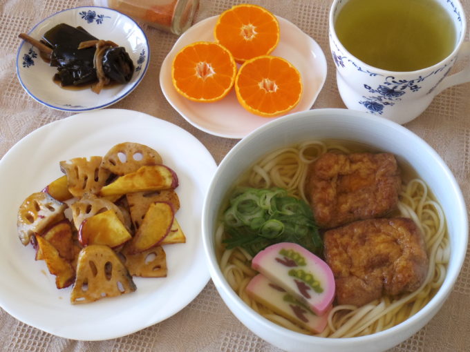 きつねうどん(乾麺90グラム。ネギ、かまぼこ、油揚げ)、レンコンとサツマイモのオイスターソース炒め、昆布巻き、ミカン